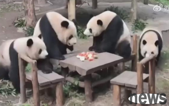 Then, the four giant pandas came slowly one by one, sat on the small benches, formed a table, and began to feast.