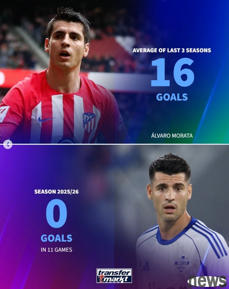 Morata: 0 goals in 11 games in Como this season, an average of 16 goals in the previous 3 seasons