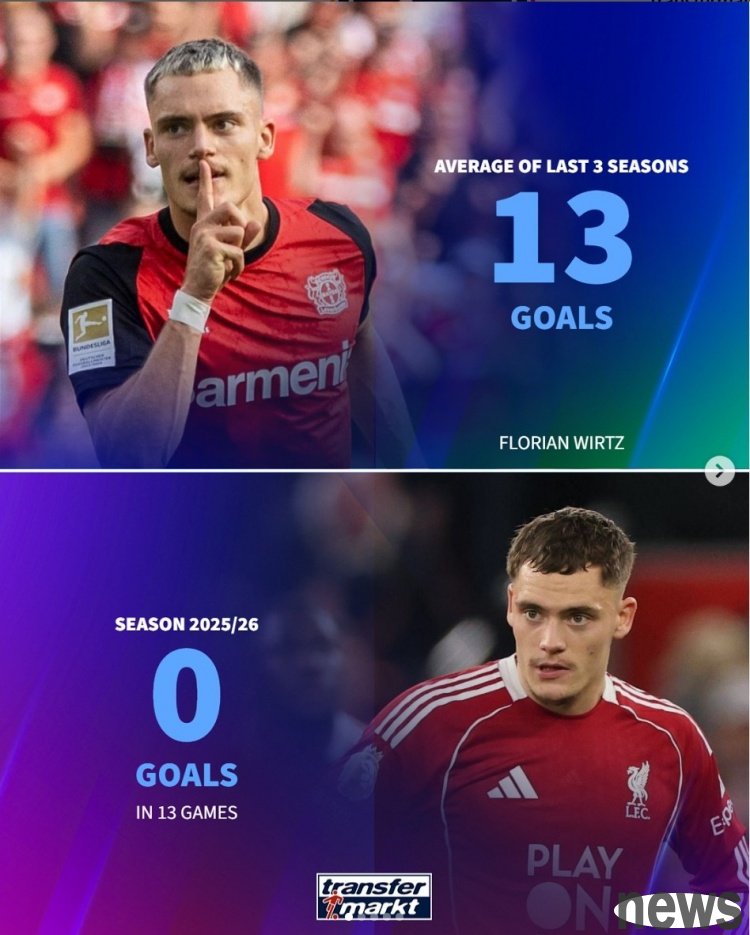 Wirtz: 0 goals in 13 games with Liverpool this season, averaging 13 goals in the previous 3 seasons