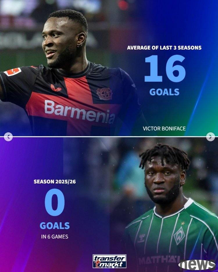 Boniface: 0 goals in 6 games in Bremen this season, an average of 16 goals in the previous 3 seasons