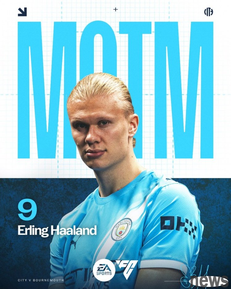 In the 10th round of the 2025-26 Premier League season, Manchester City 3-1 Bournemouth at home. Haaland started the game, contributed twice, and was elected the team's best player after the game.