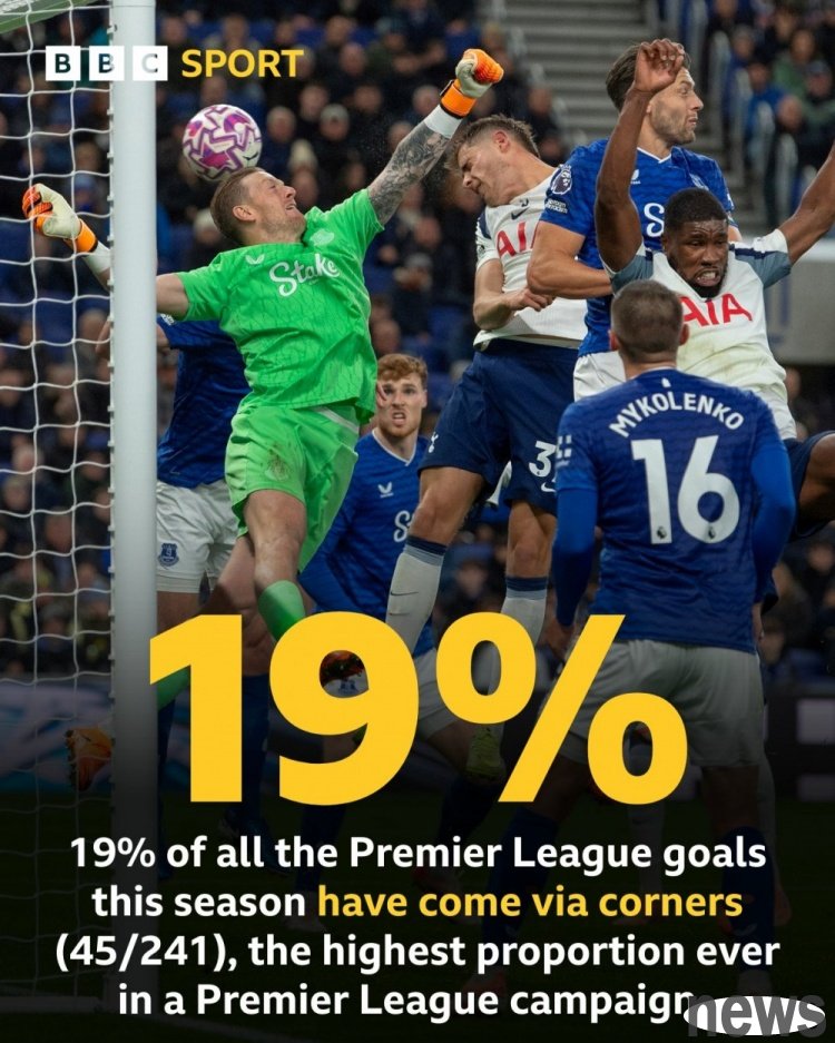 Statistics show that a total of 241 goals were scored in the Premier League this season, 45 of which came from corner kicks. The 19% rate is also the highest in a single season in the Premier League.