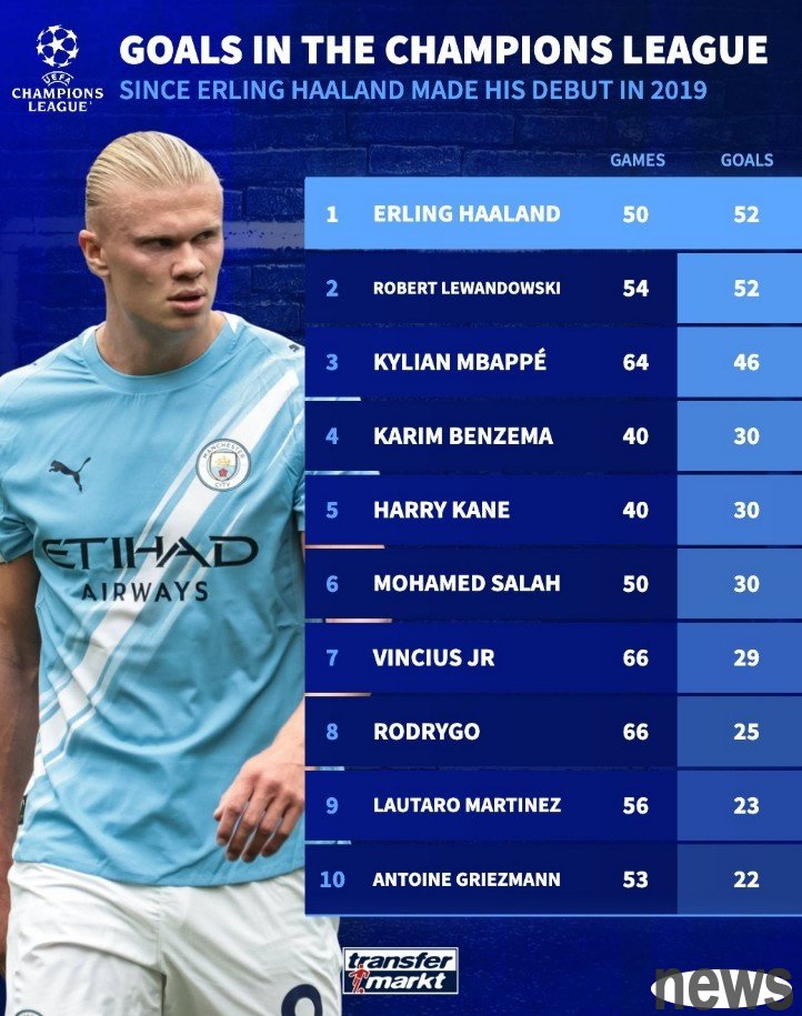 In this round of Champions League Manchester City draws Monaco 2-2, Haaland scores twice. The following are the Champions League goals list since Haaland's debut in 2019: