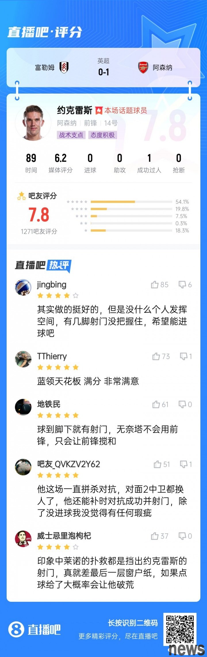 In the 8th round of the Premier League, Arsenal defeated Fulham 1-0 and led the Premier League by 3 points. Yorkres had 3 shots on goal and 2 on target, and has not scored for Arsenal in 7 games.