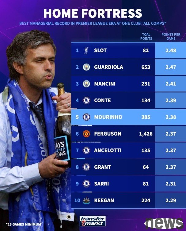 According to German transfer statistics, Slot ranked first in the average score list of home games in various competitions of a single club in the Premier League, Guardiola ranked second, Mourinho ranked fifth, and Ferguson ranked sixth.