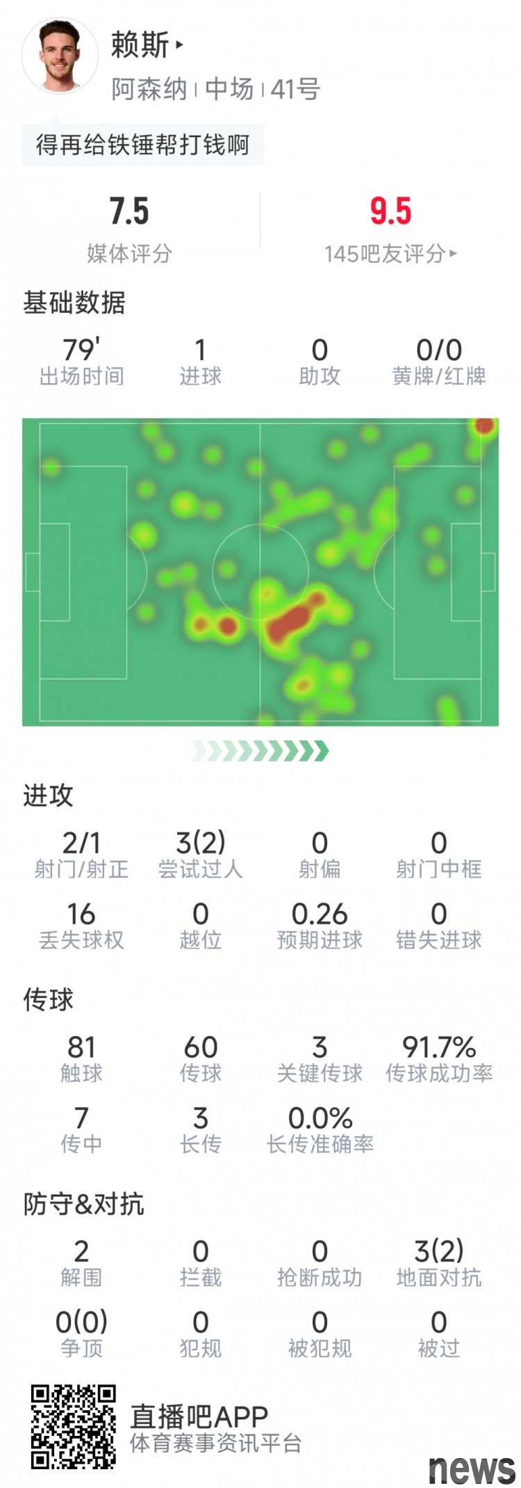 In this round of Premier League Arsenal's game against West Ham, Rice performed well. The following is his data in this game: