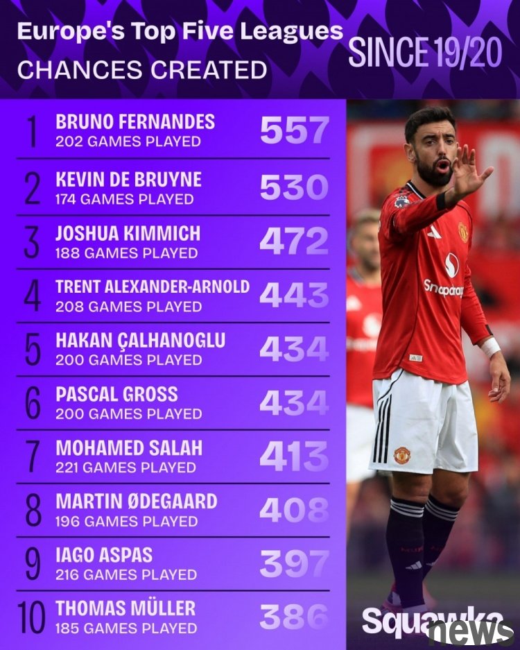 According to Squawka statistics, since the 2019-2020 season, B Fee has created 557 opportunities, the most among the five major leagues in the same period.