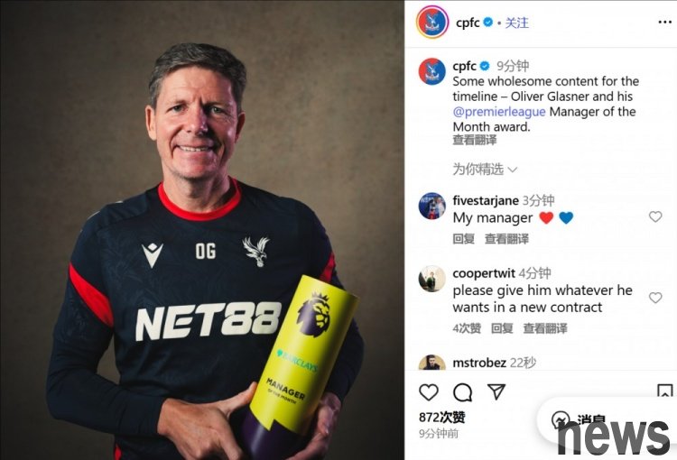 Crystal Palace officially released photos, head coach Glasner received the Premier League Best Coach Award in September.