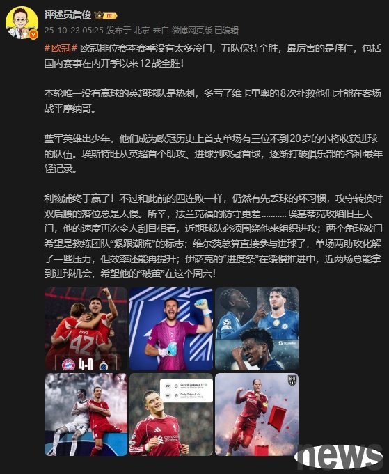 The third round of the UEFA Champions League ended. Commentator Mr. Zhan Jun made comments on social media.